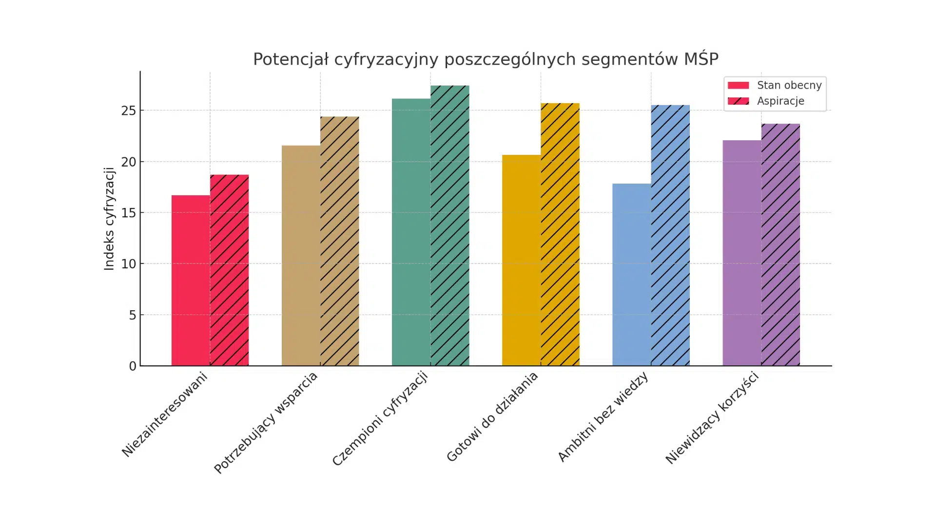 Zderzenie obecnego poziomu cyfryzacji z aspiracjami cyfrowymi poszczególnych grup ujawnia ich potencjał rozwojowy. Największe różnice pomiędzy stanem obecnym a deklarowanymi planami dotyczą „Ambitnych bez wiedzy” oraz „Gotowych do działania”. To firmy, które mają świadomość potrzeby zmian i chęć rozwoju, ale często brakuje im wiedzy, zasobów lub odpowiedniego partnera technologicznego.