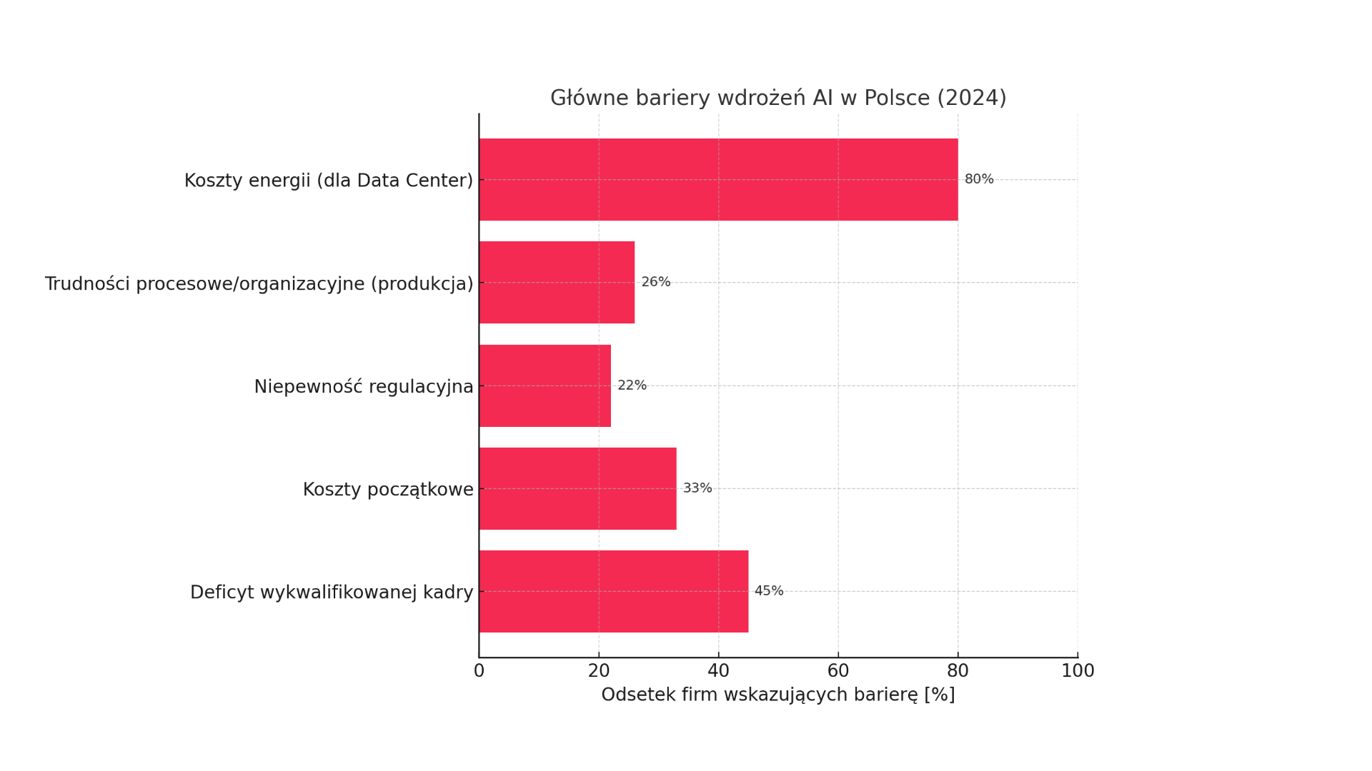 Po pierwsze, brak odpowiednio wykwalifikowanej kadry jest wskazywany jako główna przeszkoda w dalszej ekspansji AI przez 45% firm. W odpowiedzi na ten deficyt, pracodawcy oferują atrakcyjne premie i wynagrodzenia, średnio o 42% wyższe dla ekspertów w dziedzinie sztucznej inteligencji. Po drugie, koszty początkowe stanowią wyzwanie dla 33% firm. Chociaż obawy przed kosztami maleją w sektorze produkcji (z 33% do 10%), to trudności procesowe i organizacyjne rosną na znaczeniu (26% w produkcji). Po trzecie, niepewność regulacyjna dotyka 22% przedsiębiorstw, a w sektorze startupów problem ten jest odczuwalny dla aż 80% podmiotów. W sektorze usług wskazywana jest niepewność regulacyjna (17%), a w handlu – bezpieczeństwo danych (26%). Badanie Kingston dla centrów danych w Polsce potwierdza, że poza rosnącymi cenami energii, wyzwaniem są brak wykwalifikowanej kadry i regulacje dotyczące cyberbezpieczeństwa.