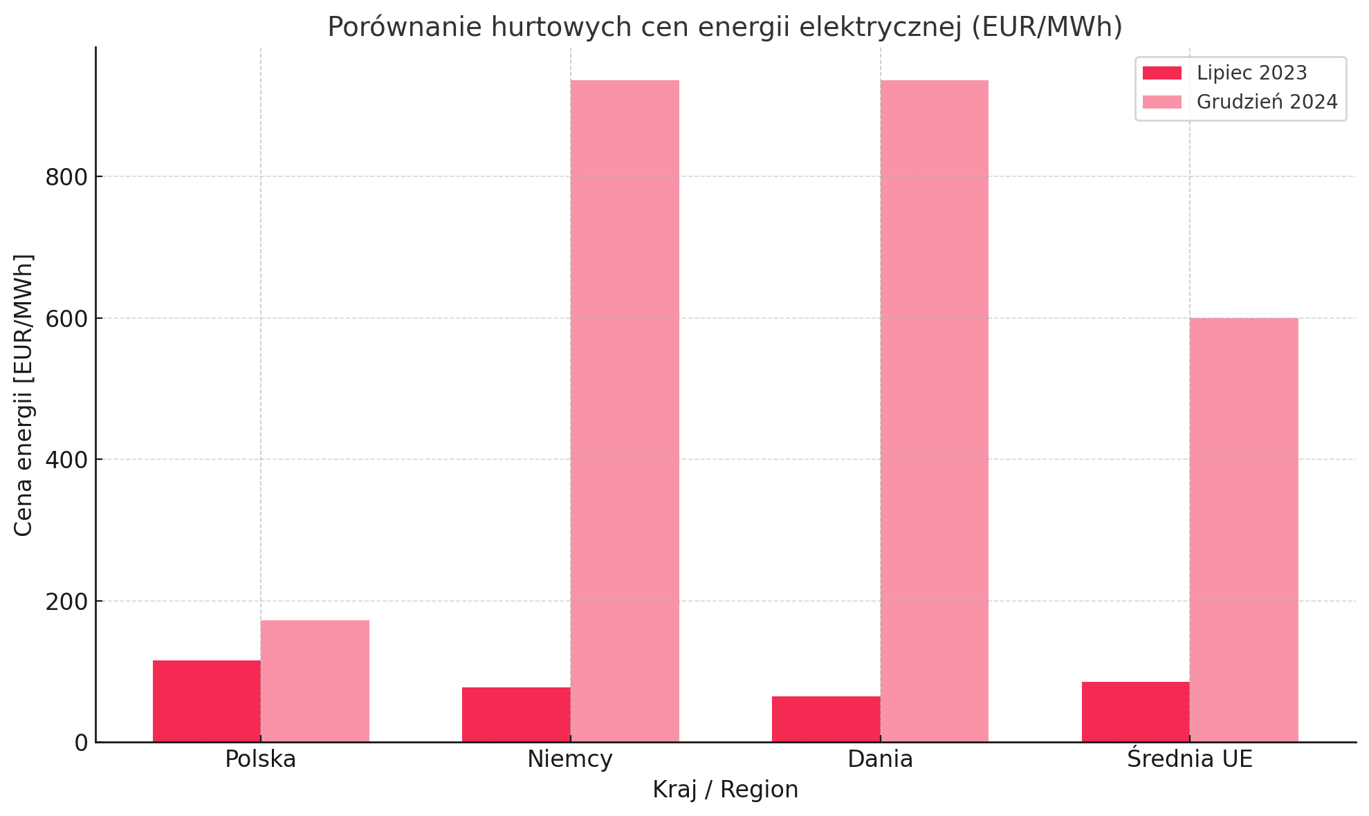 Szczegółowe porównania pokazują, że w lipcu 2023 roku hurtowa cena 1 MWh w Polsce (115,73 euro) była o około 49% wyższa niż w Niemczech (77,48 euro) i jednocześnie najwyższa w całej Unii Europejskiej. Bartłomiej Derski z portalu WysokieNapiecie.pl podkreśla, że tak niekorzystna różnica cen między Polską a Niemcami (ponad 200 zł) nie miała miejsca w historii. Jest to w dużej mierze spowodowane tym, że Polska płaci więcej za uprawnienia do emisji CO2, a koszt wytworzenia prądu z polskiego węgla, przekraczający 330 zł za 1 MWh, jest droższy od węgla importowanego. Pod koniec 2024 roku małe firmy miały możliwość zakontraktowania energii na 2025 rok po cenie poniżej 50 gr/kWh netto. Niemniej jednak, w grudniu 2024 roku polska energia kosztowała średnio 172 euro za megawatogodzinę, co było znacznie mniej niż w Niemczech czy Danii, gdzie stawki osiągnęły 936 euro/MWh. Mimo to, koszty kontraktów rocznych na 2025 rok w Polsce (około 100 euro/MWh) są już o 9% wyższe niż w Niemczech i o 25% wyższe niż w Danii. To wskazuje, że chwilowo niższe ceny bieżące nie przekładają się na długoterminową przewagę konkurencyjną.