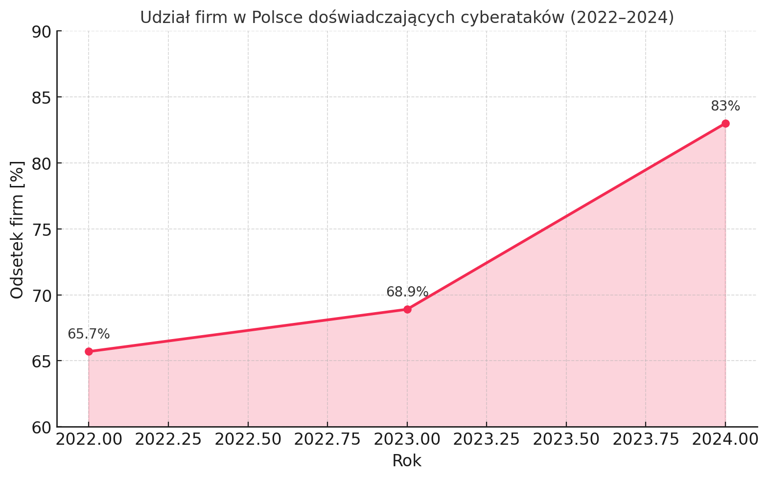 Badania wskazują, że wysoki poziom cyberzagrożeń dotyka również polskie firmy. W 2024 roku aż 83% firm doświadczyło przynajmniej jednej próby cyberataku, co stanowi wzrost o 16 punktów procentowych w porównaniu z rokiem poprzednim. Zaledwie 17% firm nie odnotowało żadnego cyberataku, co jest najniższym wynikiem w historii badań. W 2023 roku 68,9% polskich firm potwierdziło wystąpienie cyberincydentu, co stanowi wzrost w porównaniu z 65,7% w roku 2022.