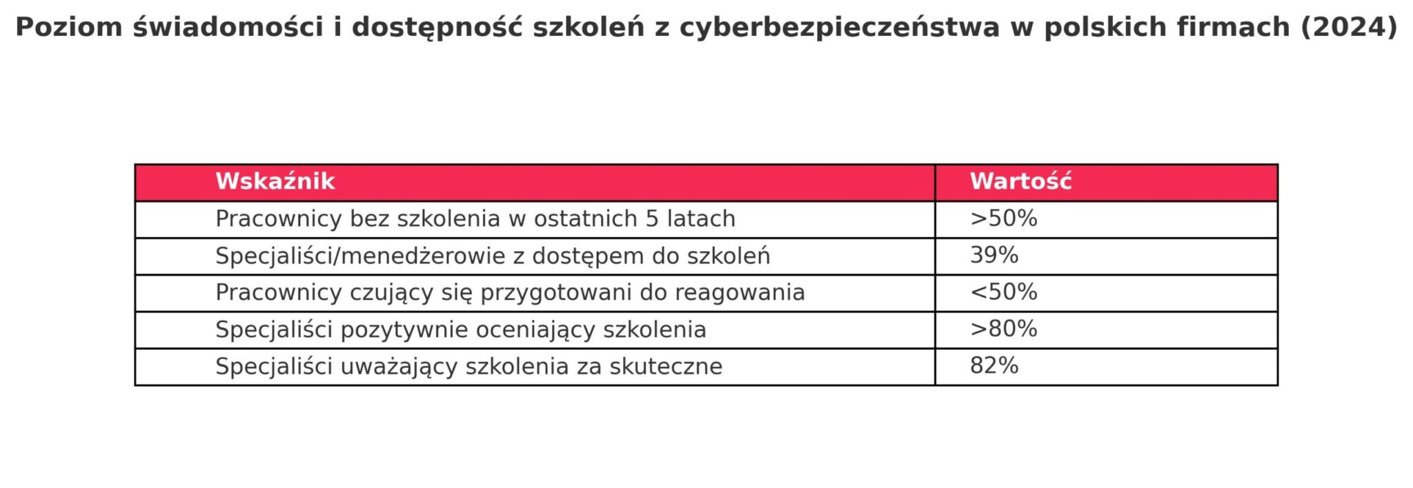 Mimo rosnącej świadomości i dostępności szkoleń, badania wskazują, że w wielu polskich firmach nadal brakuje regularnych programów edukacyjnych z zakresu cyberbezpieczeństwa dla pracowników. Raport „Cyberportret polskiego biznesu” z 2024 roku ujawnił, że ponad połowa pracowników nie przeszła żadnego szkolenia z cyberbezpieczeństwa w ciągu ostatnich 5 lat. Jedynie 39% specjalistów i menedżerów ma dostęp do tego typu szkoleń w swoim miejscu zatrudnienia.