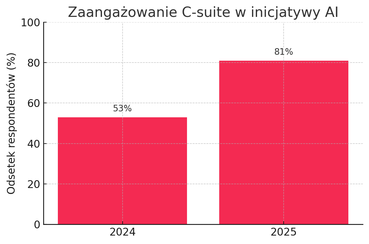 W krajobrazie biznesowym roku 2025 sztuczna inteligencja (AI) nie jest futurystyczną koncepcją, stała się za to kluczowym motorem innowacji i transformacji w niemal każdej branży. Jak wynika z raportu Flexential, inicjatywy związane z AI są coraz częściej napędzane przez najwyższe kierownictwo, o czym świadczy wzrost zaangażowania kadry zarządzającej C-suite do 81% respondentów, w porównaniu z 53% rok wcześniej.