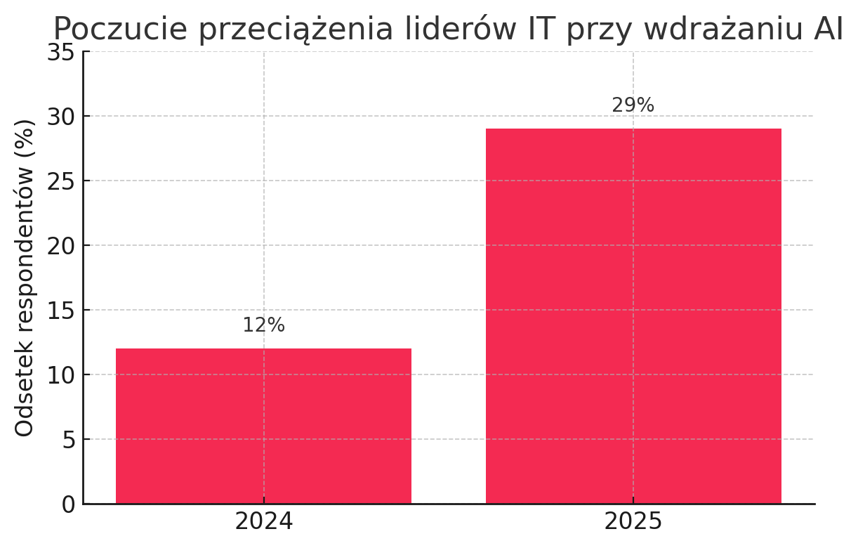 Jednakże, to przyspieszenie podyktowane przez kierownictwo nie jest pozbawione wyzwań. Prawie jedna trzecia (29%) liderów IT przyznaje, że czuje się przytłoczona wymaganiami wdrożeniowymi AI, co stanowi ponad dwukrotny wzrost w porównaniu z rokiem poprzednim (12%). To poczucie przeciążenia sygnalizuje rosnącą złożoność implementacji AI i potencjalne obciążenie istniejących zasobów IT. Pomimo tych trudności, entuzjazm dla AI pozostaje wysoki, a 75% respondentów wyraża podekscytowanie wdrożeniami AI w swoich organizacjach. Co więcej, 71% liderów IT jest bardzo pewnych swojej zdolności do realizacji planów działania AI, co stanowi znaczący wzrost w porównaniu z 53% w roku poprzednim. Niemniej jednak, ta optymistyczna perspektywa może okazać się nieuzasadniona, jeśli podstawowe ograniczenia infrastrukturalne nie zostaną odpowiednio uwzględnione w strategicznym planowaniu.