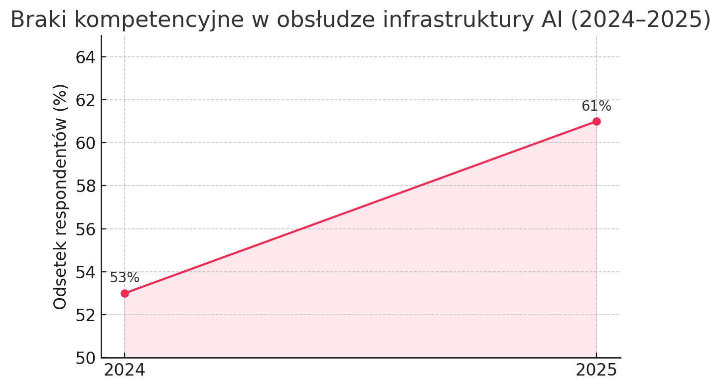 Ograniczenia infrastrukturalne, które hamują ambicje AI, mają wiele przyczyn. Jednym z kluczowych problemów jest rosnący niedobór umiejętności w zarządzaniu specjalistyczną infrastrukturą obliczeniową. Odsetek organizacji doświadczających takich braków wzrósł z 53% do 61% w ciągu ostatniego roku. Nawet przy posiadaniu odpowiedniej infrastruktury, brak wykwalifikowanego personelu do jej obsługi i optymalizacji może stanowić poważne wąskie gardło w skalowaniu AI.