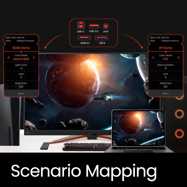 Złącza HDMI, DP i USB-C pozwalają na łatwe przełączanie między sygnałami źródłowymi bez ciągłego podłączania i odłączania kabli. Zapewniają one także zgodność i pełne wykorzystanie możliwości najnowszych konsol do gier PS5 i Xbox X oraz komputerów PC.