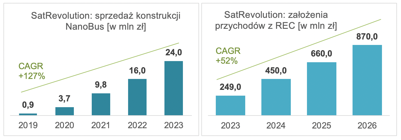 W najbliższym czasie głównym źródłem przychodów SatRevolution będzie sprzedaż konstrukcji i podzespołów do nanosatelitów. – Planujemy zwiększenie sprzedaży NanoBusów z dwóch sztuk w 2018 roku do jedenastu w 2022 – zapowiedział Damian Fijałkowski. – Docelowo, w miarę rozwoju inwestycji w konstelację REC i wynoszenia kolejnych satelitów na orbitę, zamierzamy osiągnąć 2-procentowy udział w globalnym rynku, z przychodami 660 mln zł w 2025 roku i 870 mln zł w 2026 – dodał CFO spółki.